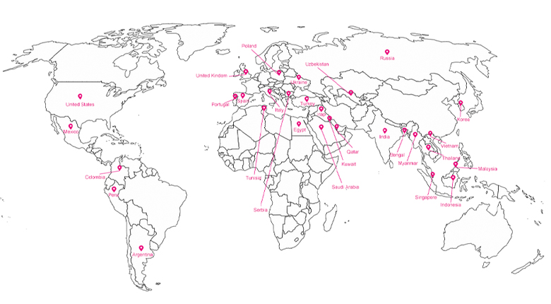 Indonesia, South Korea, Turkey, India, Uzbekistan, Saudi Arabia, Bangladesh, Thailand, Malaysia, Vietnam, Iran, Philippines, Iraq, Kuwait, Qatar, United Arab Emirates, Singapore, Myanmar, Georgia, Kazakhstan, Sri Lanka, Kyrgyzstan